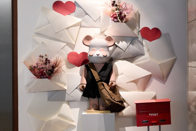 穿着模仿邮递店的洋装的熊猫迎接大家。