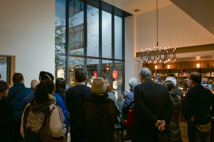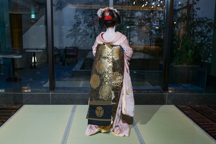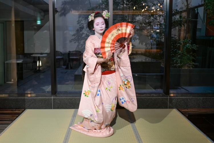 活动在HOTEL RESOL TRINITY KYOTO的大堂举行。榻榻米空间营造出传统日式茶室的氛围。舞妓在柔和的三味线和笛声中亮相。